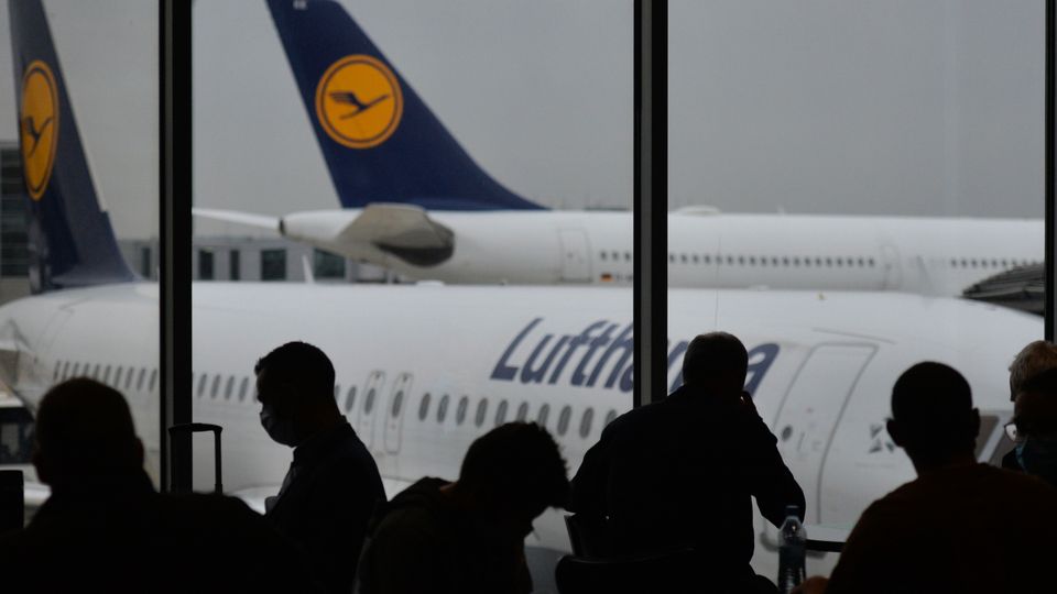 Passagiere warten am Flughafen auf einen Lufthansa-Flug