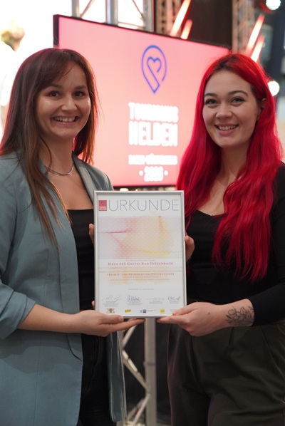 Das Tourismus-Team im Haus des Gastes Bad Ditzenbach ist offiziell zu „Tourismushelden“ in der Kategorie Freizeit- und Reisebranche/Destinationen gekürt worden. Am Mittwoch,den 21. Januar,fand die Verleihung der „Tourismushelden“ im Rahmen der CMT-Messe statt. Dort wurden engagierte Personen und Organisationen aus ganz Baden-Württemberg von Dr. Patrick Rapp,Staatssekretär im Ministerium für Wirtschaft,Arbeit und Tourismus,offiziell ausgezeichnet. Die Auszeichnung würdigt Menschen,die mit Leidenschaft,Kreativität und Engagement ihre Region erlebbar machen und damit den Tourismus nachhaltig voranbringen.