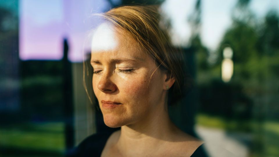 Eine Frau schließt die Augen und versinkt in Gedanken (Symbolbild)