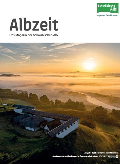 Die Gästezeitung „Albzeit“ 2026 ist ab sofort kostenlos erhältlich. Interessierte können die Gästezeitung online unter www.schwaebischealb.de/prospekte per Post nach Hause bestellen,digital herunterladen oder direkt auf der Webseite lesen. Zudem liegt die „Albzeit“ in vielen Tourist-Informationen der Region zur kostenfreien Mitnahme aus.