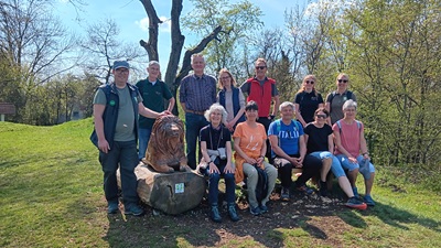 Foto (Landratsamt Göppingen): Die Wegepatinnen und Wegepaten der Löwenpfade treffen sich einmal im Jahr zum gemeinsamen Austausch und zum gemeinsamen Wandern. In diesem Jahr ging es auf dem Löwenpfad Filstalgucker bei herrlichem Sonnenschein durch Wald und Flur.